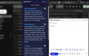 La herramienta incluye un filtro de 'Ramble' que utiliza tecnología avanzada de IA para corregir la gramática y estructurar las oraciones. Además, su ventana flotante permite realizar multitareas sin interrupciones, manteniéndose siempre visible mientras se trabaja en otras aplicaciones. SpeakSmart también prioriza la privacidad, permitiendo que los usuarios utilicen su propia clave de API de OpenAI, asegurando que los datos de audio no sean almacenados ni accesibles por terceros.